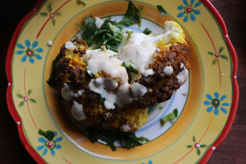 preheat oven to 400F. remove the stem, leaves and core from the cauliflower. if a floret breaks off in this process, use a toothpick to reattach. in a bowl, combine turmeric, cumin, cayenne pepper, salt, saffron and olive oil. mix well. drizzle this mixture onto the cauliflower until covered. place in oven and cook till exterior is browned (it’s already golden due to the turmeric!), about 45 minutes or so. serve on a bed of lettuce or parsley, with extra lemons and tahini yogurt to drizzle!